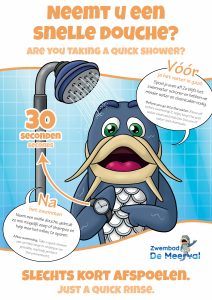 Een korte douche, een groot verschil — voor jou, het water en het milieu Voordat je bij Zwembad De Meerval het water in gaat, vragen we je om even te douchen. 30 seconden onder de douche is al genoeg om een groot